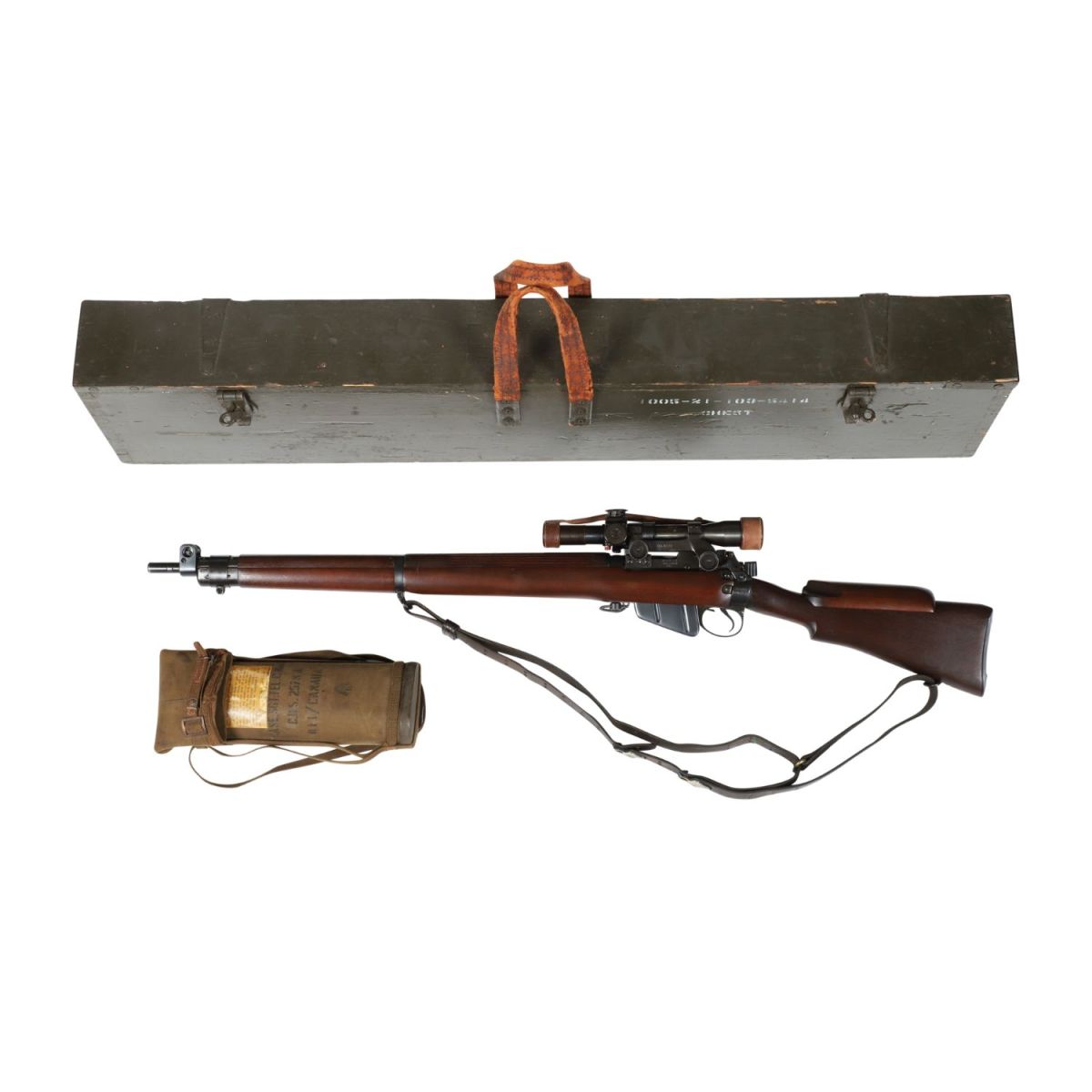 Lot #44 is a British Holland and Holland converted No. 4 Mk I* (T) Lee-Enfield sniper rifle, in a matching transit chest. The .303 British caliber, No. 32 Mk. 3 scope rifle was manufactured by BSA Shirley (M47C) and converted by Holland and Holland in 1944. It has all correct sniper markings and the rifle itself is all matching, including the receiver, bolt, forend and magazine. The scope also matches. The good transit chest has the original labels. Estimate: $9,000-$12,500.