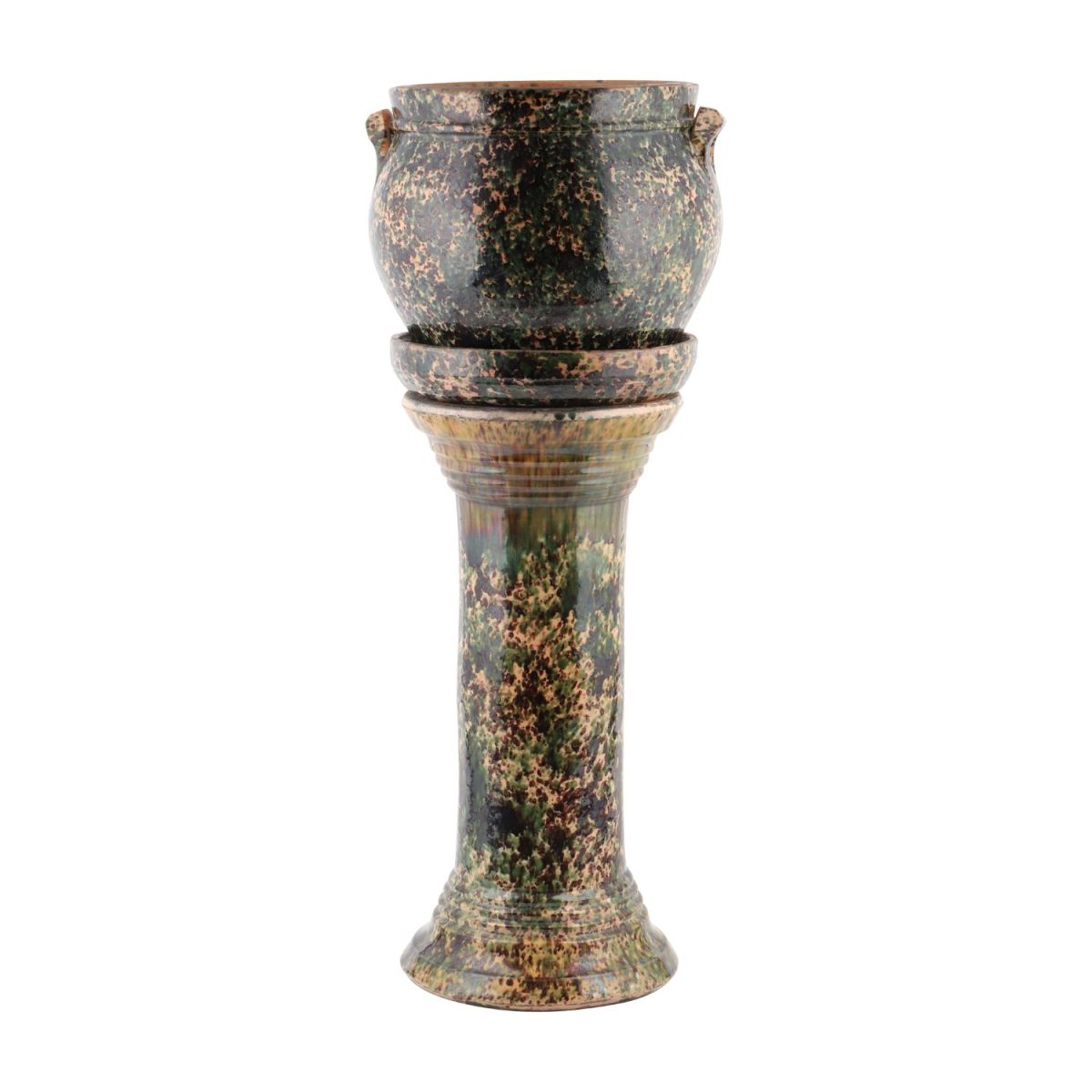 It’s a monumental three-piece plant stand, nearly 30 inches tall, boasting a spectacular glaze with heavy green and brown mottling over a peach color base. The three pieces consist of a column base, large saucer, and a planter, all in near mint condition. The sale also features a number of Jacobi pitchers in a distinct and striking glaze, with dark green mottling over a deep peach base.