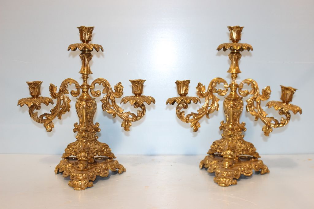 Pair of finely cast Brass candlesticks. Pair of three arm Louis XV style ormolu candlesticks with grapes, scrolls, and dolphins; 17" h., 14 1/2" w.