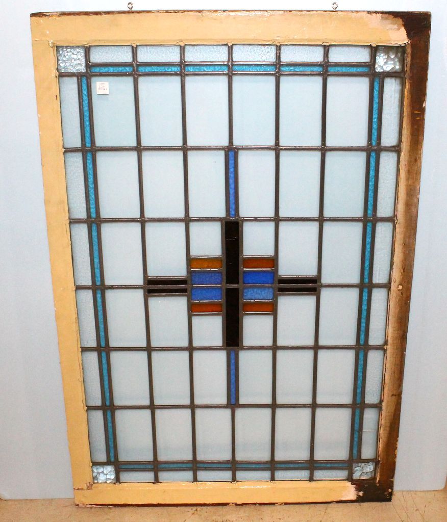 Antique prairie school style blue and gold geometric stain, leaded glass window; 33''w., 49''h.