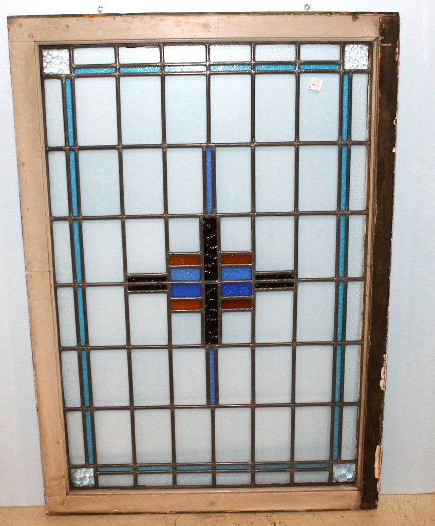 Antique prairie school style blue and gold geometric stain, leaded glass window; 33''w., 49''h.