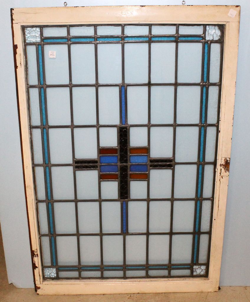 Antique prairie school style blue and gold geometric stain, leaded glass window; 32 1/2'' w., 49'' h.