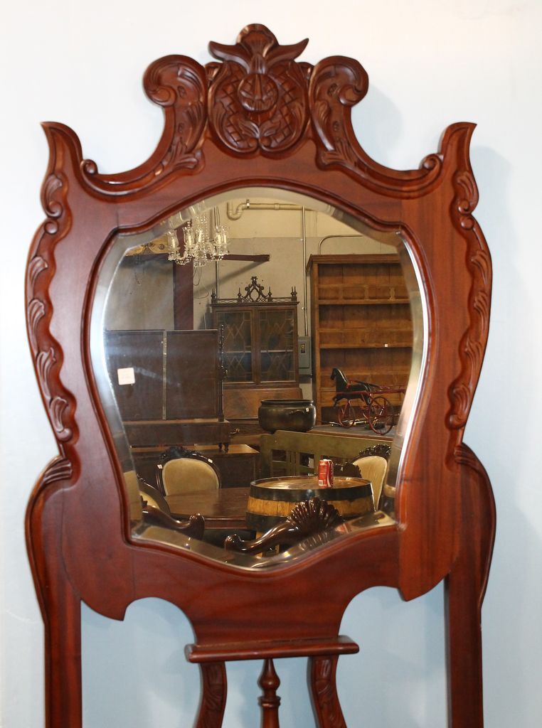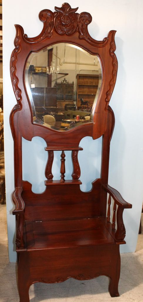 Mahogany lift seat hall tree with center beveled glass mirror; 32''w., 19''d., 85''h.