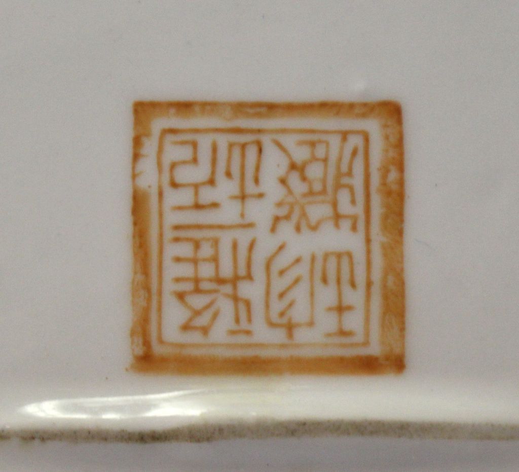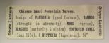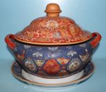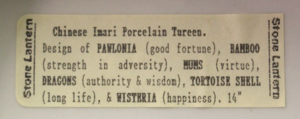 Chinese Imari porcelain tureen design of pawlonia (good fortune), bamboo (strength), mums (virtue), dragons (wisdom), tortoise shell (long life), and wisteria (happiness). Tureen has under plate. Underplate, 13" w.; tureen, 14" w., 10 1/2" h.