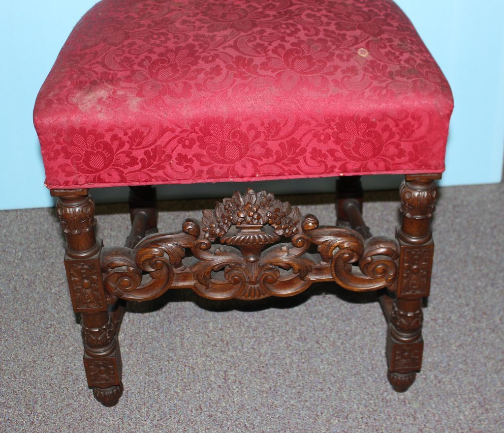 19th century heavily carved walnut hall chair. Jacobean style heavily foliage carving on crest; 16 1/2" w., 18" d., 50 1/2" h.