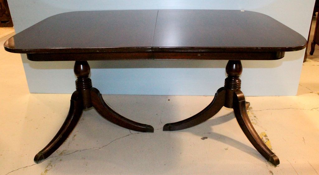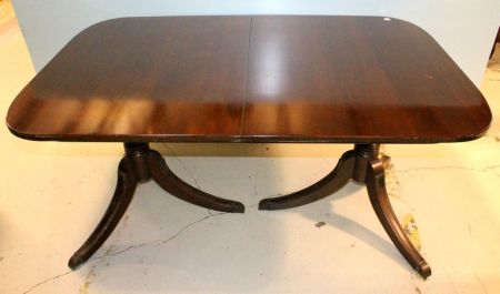 Mahogany Duncan Phyfe style dining table, two pedestal, feet with brass caps, three leaves; 62" w., 42 1/2" d. 29" h.