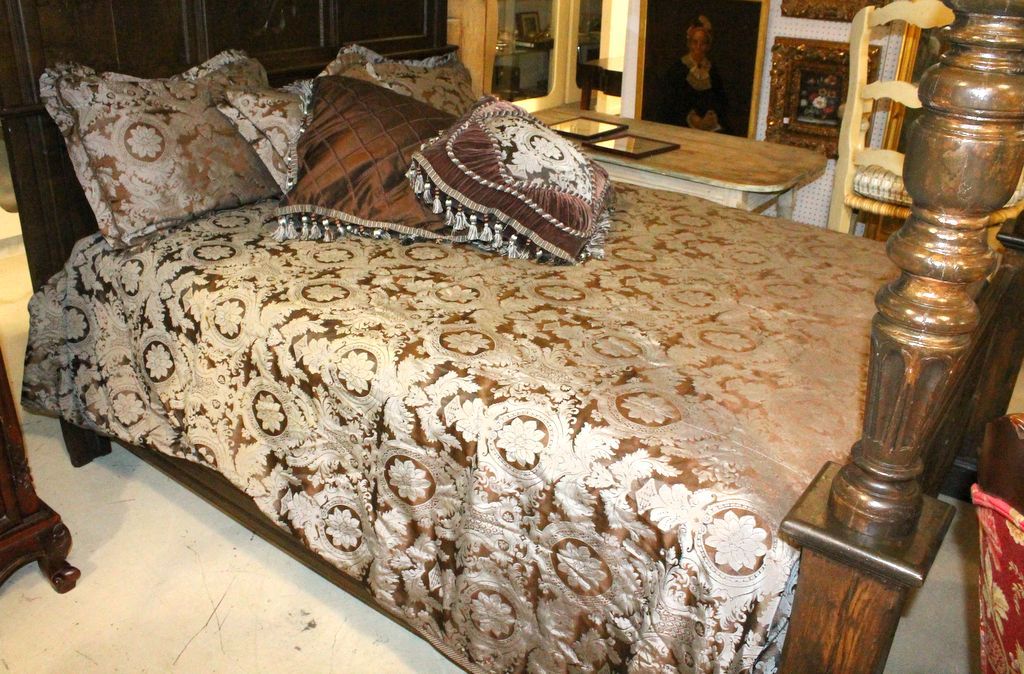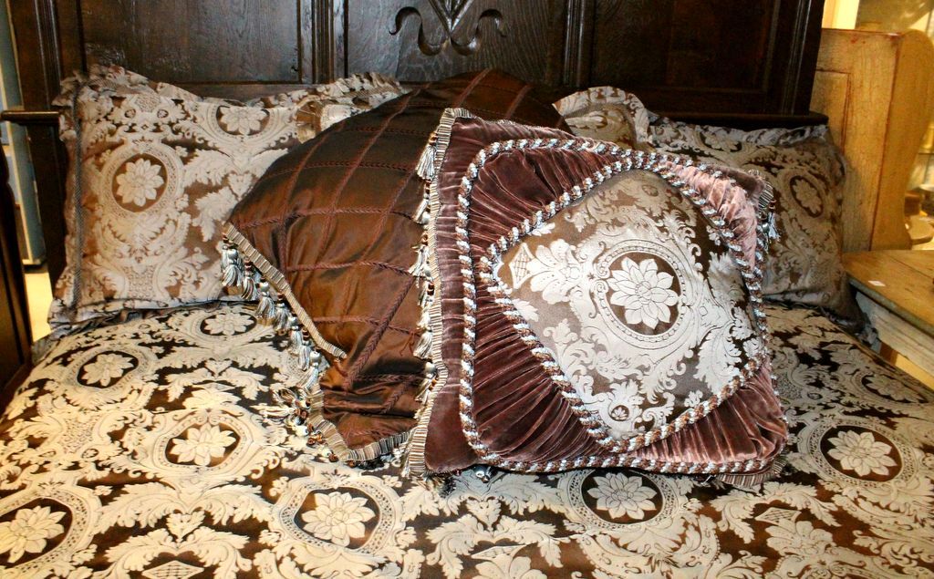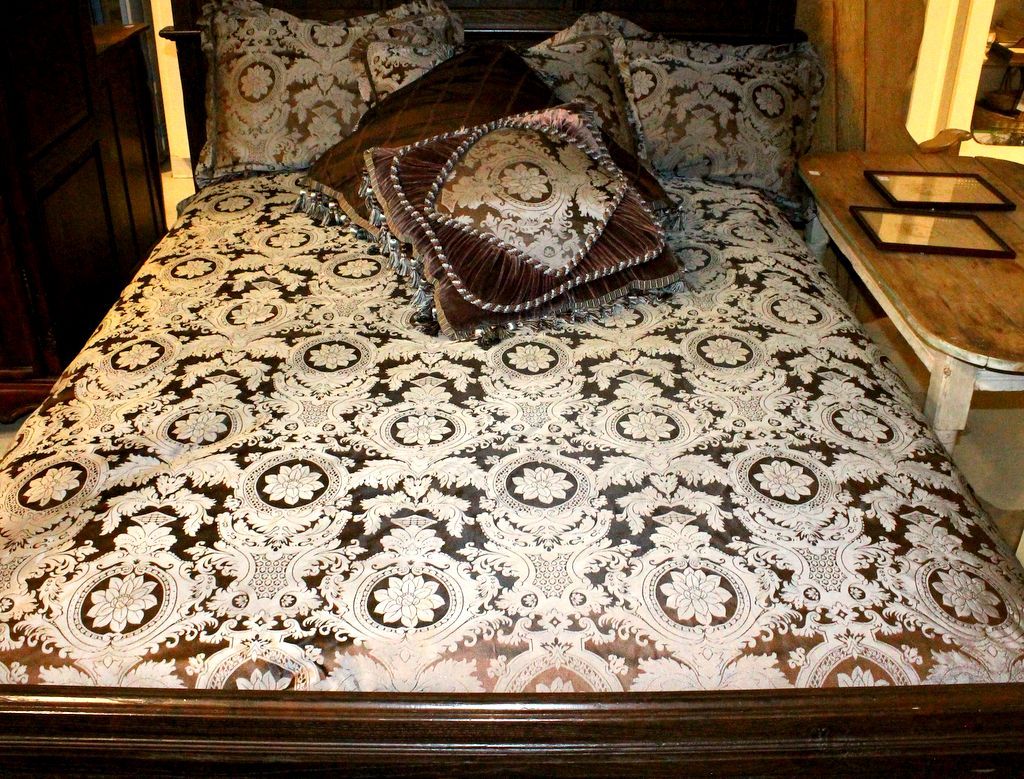 Queen size bedspread and five pillows from the Isabella Collection. Beautiful satin damask, velvet/ satin pillows with fancy fringe