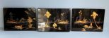 1549 Three Oriental Paintings on Black Lacquer Description: Three Oriental Paintings on Black Lacquer, marked on back made in Vietnam. Each measures 9 1/2" w. by 7" h.