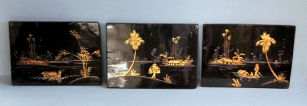 Three Oriental Paintings on Black Lacquer Description: Three Oriental Paintings on Black Lacquer, marked on back made in Vietnam. Each measures 9 1/2" w. by 7" h.