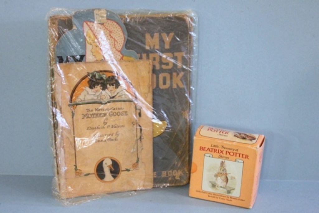 Vintage Children's Books Description: 1935 fabric copy of Mother Goose; My First Book, 1936 My Coloring Book Storybook, Paper copy of Mother Goose and group set of Beatrix Potter stories