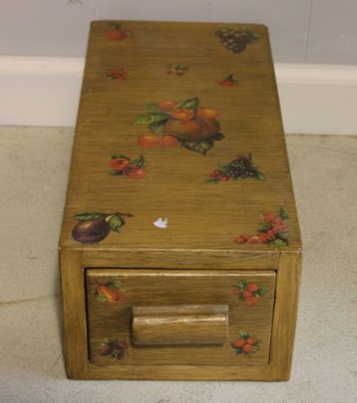 1564 Recipe Box, Wood Grain with Fruit Transfer Decoration Description: Recipe Box, wood grain with fruit transfer decoration, 61" l, 8" w.