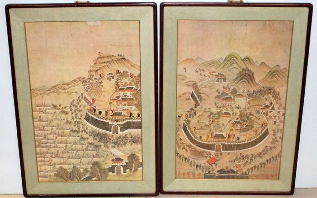 1591 Pair Handpainted Panels Pair early 20th century handpainted on paper Chinese landscape and warrior scene with fabric matte and gold liner; 23" w., 32 1/2" h.