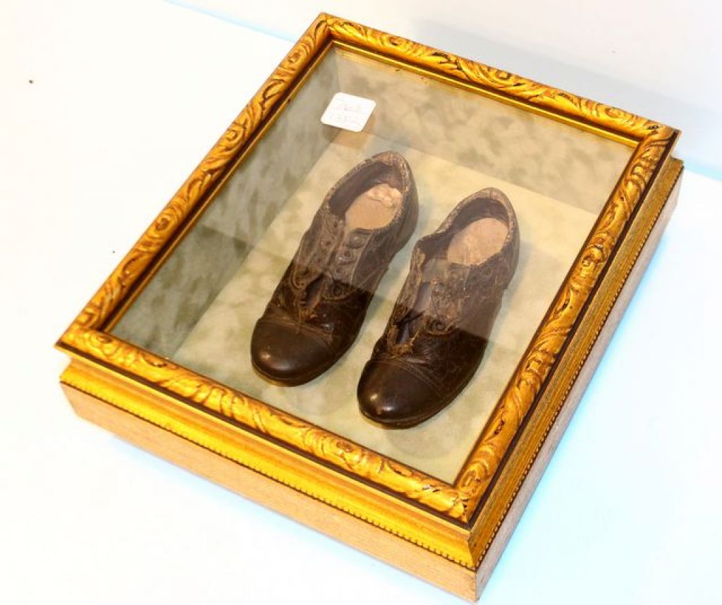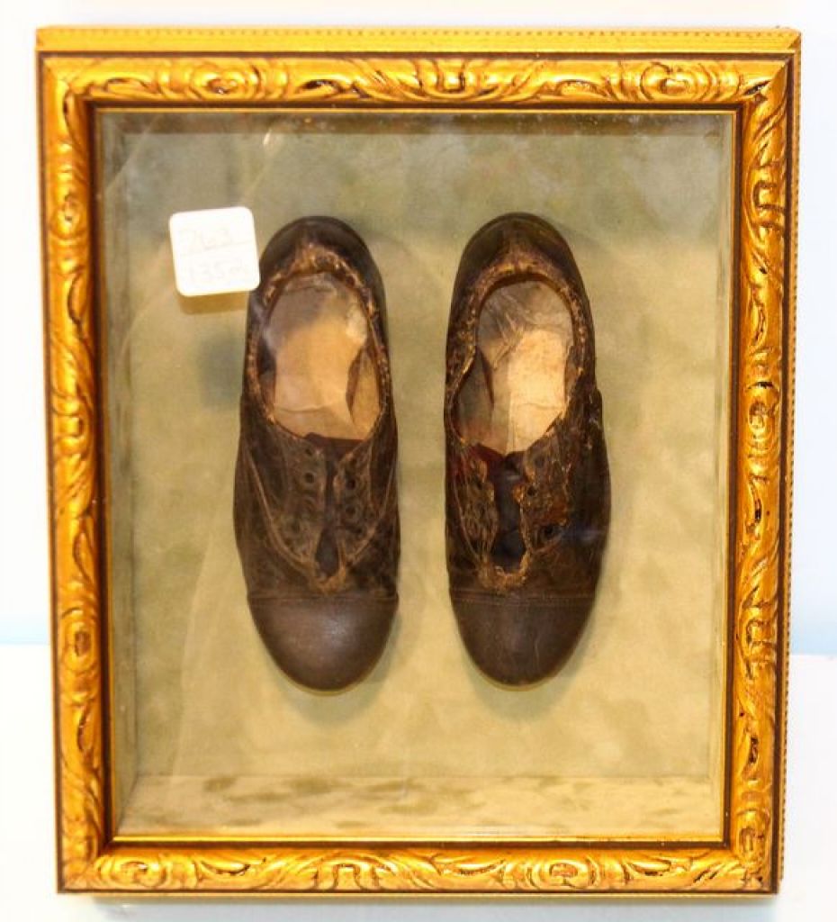 1592 Pair of Childs Shoes in Shadowbox Frame 9" w., 11" h.