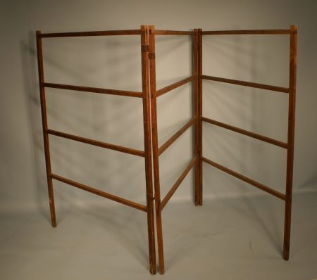 Primitive Drying Rack in Pine, last quarter 19th century, with 12 drying rods pegged through the standing frame. 54 1/2" h., 39" w.