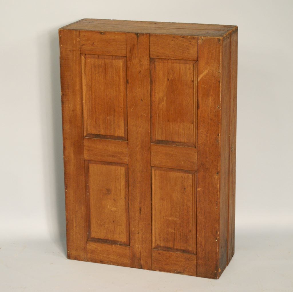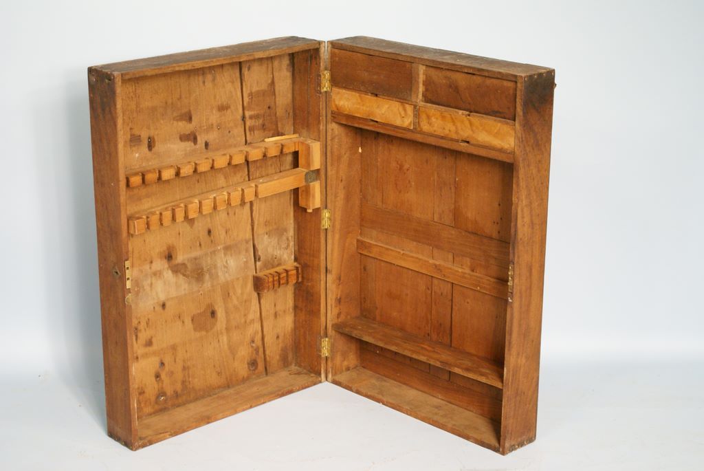 Nice Dove Tailed Folding Artist Cabinet, first quarter 20th century, with brush holders and paint compartments, dove tailed and hand hued paneled exterior. w. 21" h. 32"