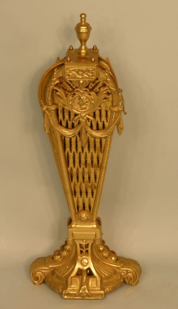 Cast and Reticulated Brass Folding Fire screen, of fan form in the Louis XVI taste, third quarter 20th century, the upper standard with a Roman Head masque.