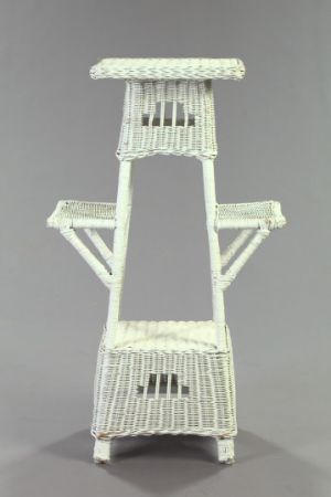 American Late Victorian Wicker Plant Stand, early 20th century, the central stand with an interior lower shelf and flanked by two exterior side shelves, h. 42", w. 25", d. 15".