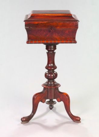 Fine Victorian Rosewood Sewing Stand, mid-19th century, of Regency inspiration, the hinged lid with large molded edge opening to a void interior, mounted to a turned and carved standard with three outstretched cabriole-form legs, h. 29-1/2", w. 14-1/