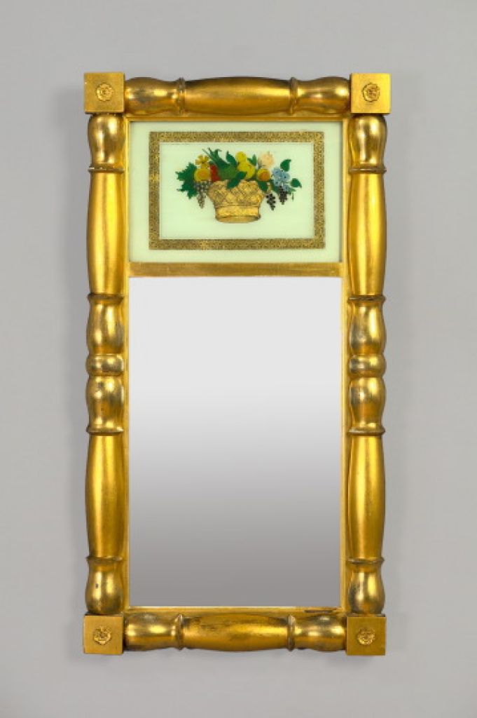 Good American Classical Giltwood and Eglomise Vertical Oblong Looking Glass, second quarter 20th century, the white-ground eglomise panel featuring a polychromed and gilded basket of flowers, the matte- and bright-finished gilding professionally rene