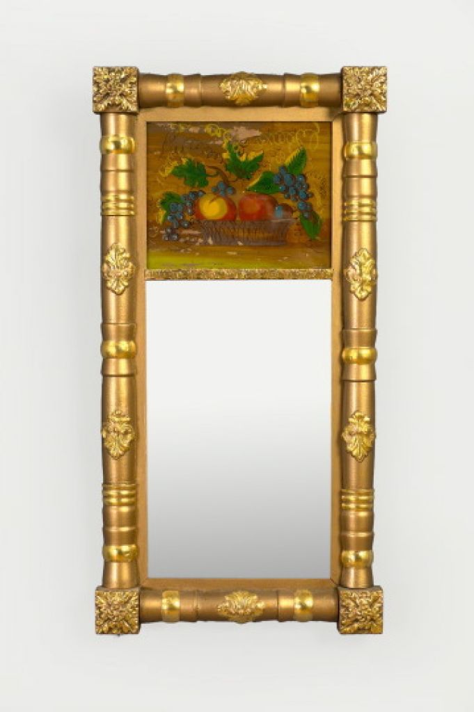 Attractive American Classical Carved Deux-Couleur Gilded Wood and Eglomise Looking Glass, second quarter 19th century, the eglomise panel featuring a polychromed basket of fruit, the gilding professionally renewed, h. 29-1/2", w. 15".