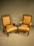 Vice Fine Pair of Walnut Eastlake Upholstered Arm Chairs , Walnut Wood with detailing. -h. 40" x w. 24"