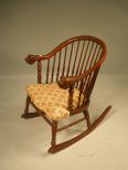 Mahogany Rocking Chair featuring a spindled Barrel back with curved arms that end with a carved Lion's Head. H. 32" x w. 22 3/4"