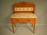 Nice english marble top washstand on rollers. Backsplash has 4 brown and white floral pattern 6" x 6" tiles. -h. 47" x w. 36 1/4" d. 18 1/4"