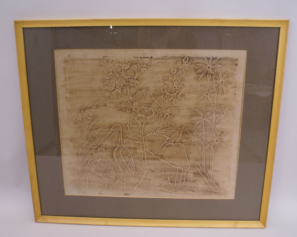 Art rubbing of wildlife and birds from the WAT PO Buddhist Temple in Bangkok, Thailand, 1972. Rubbing is one of the most universal and perhaps oldest of the techniques used in printmaking, h. 23", w. 27"