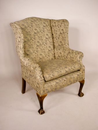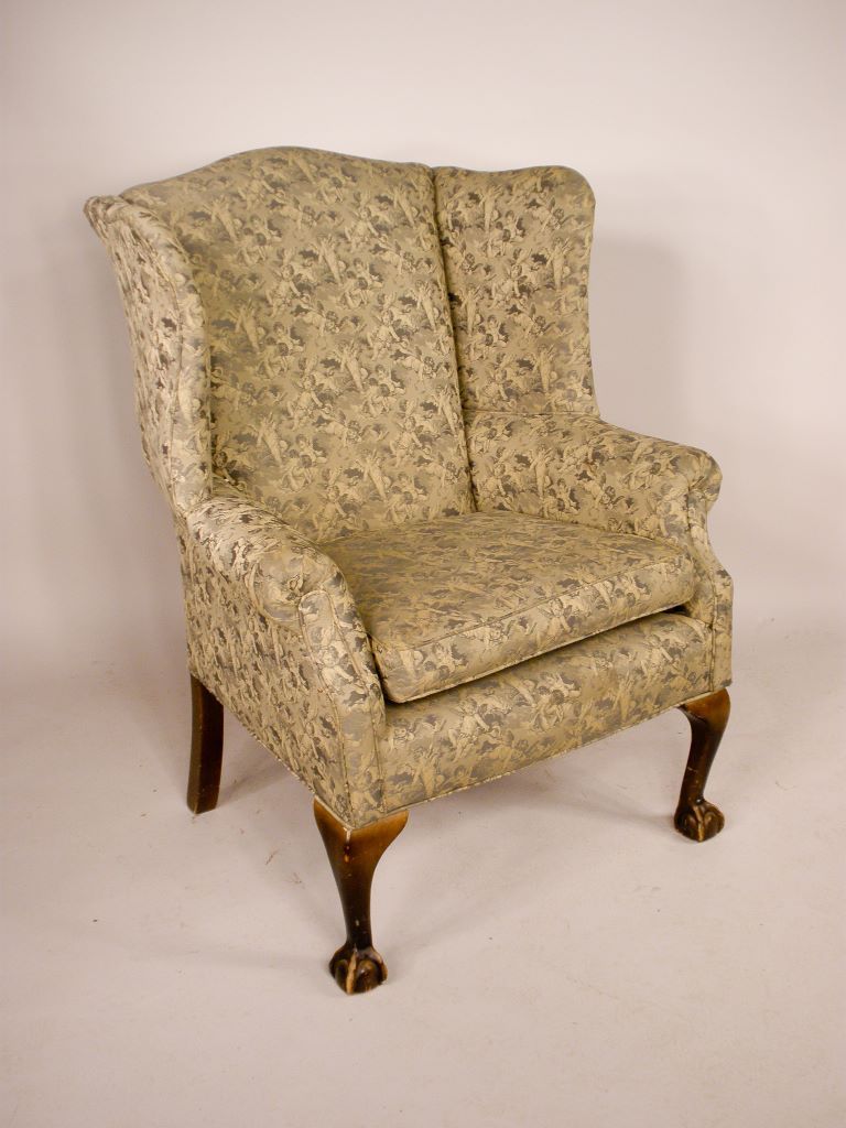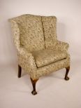 Chippendale Style Wing Chair with blue and khaki upholstery, 43 1/2 h 32 w