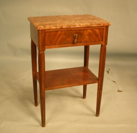 French Marble Top end Table, one drawer and cabinet. -h. 30" x w. 20" d. 13 3/4"