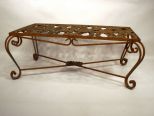 Heavy iron piece from old gate made into Coffee Table with Decorative Bowed Legs and thick hand chiseled glass top, Glass top custom made by Andy Young at Pearl River Glass Studio. 18 h 45 1/2 w 29 d