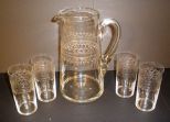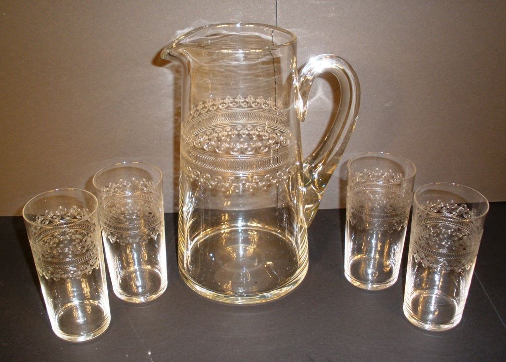 Elegant Glass Hand Blown & Etched "Barware" Lemonade Set w/Tatting Design, circa. 1910-1920, pitcher w/4 tumblers. Pitcher 9 1/2" h., Tumblers 4 1/2"h.