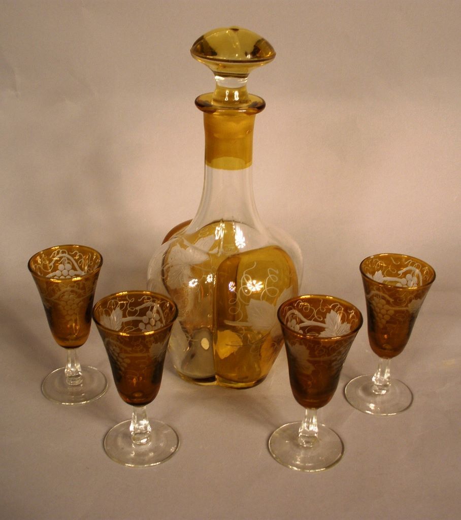 Bohemian Cut Overlay Amber and Clear Decanter & 4 aperitif glasses. Decanter and glasses are etched with pretty grapevine design. Decanter 10" h, glasses 4"h.