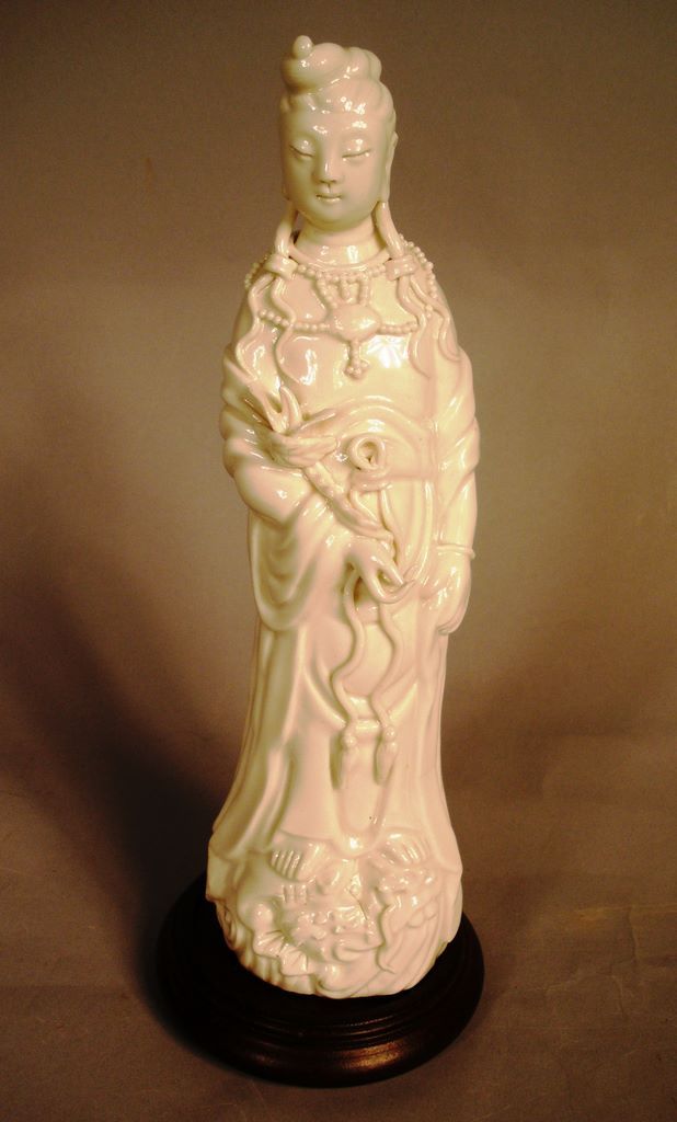 Delicate Blanc de Chine porcelain figurine on stand of the Goddess of Compassion, Guanyin. Fine Chinese porcelain art form with impressed calligraphic marks, 11 1/2"h.