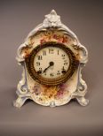 Ansonia Royal Bonn Porcelain Mantel Clock. Beautiful hand painted floral design with brass frame bezel. Hairline crack at bottom. 10"w x 12"h x 5"d