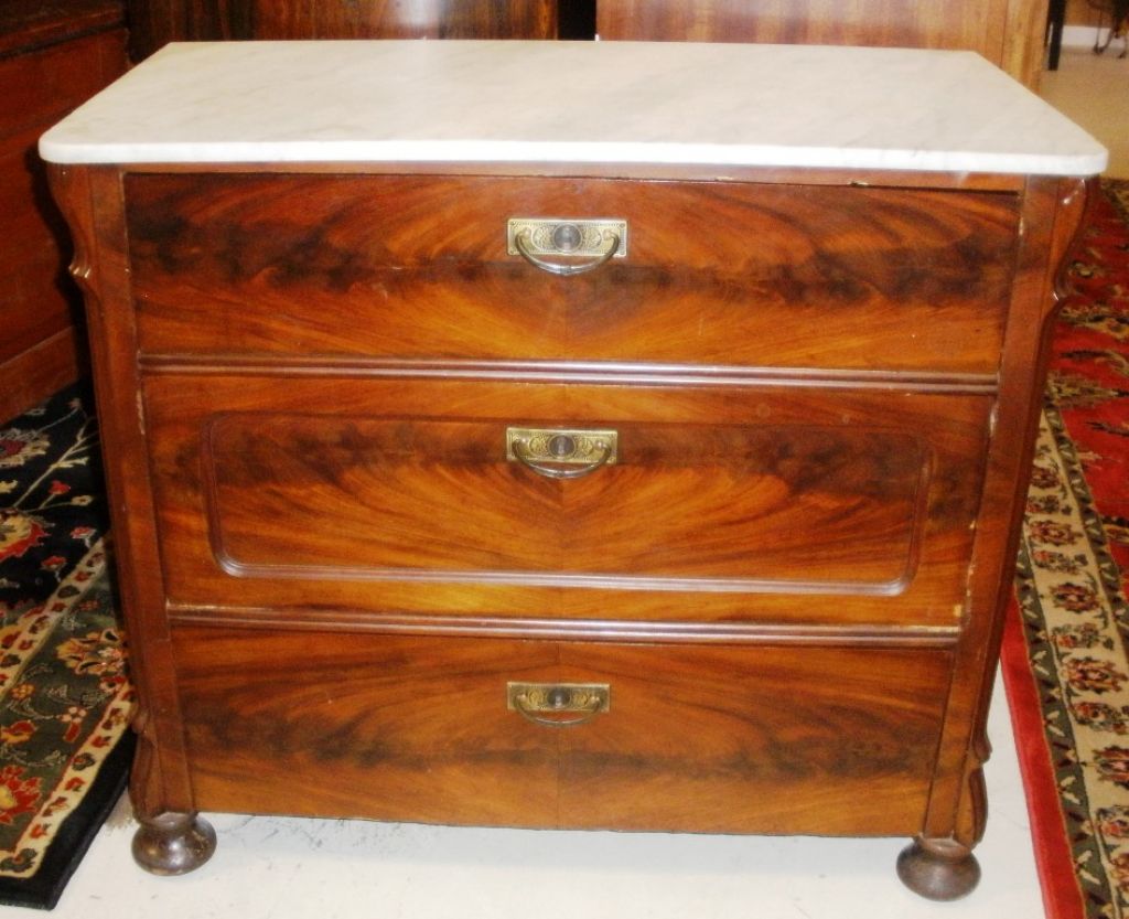 19th Century mahogany marble top dresser w/unusual Victorian pulls. Three drawers supported by bun feet. 39"w x 20"d x 32"h.
