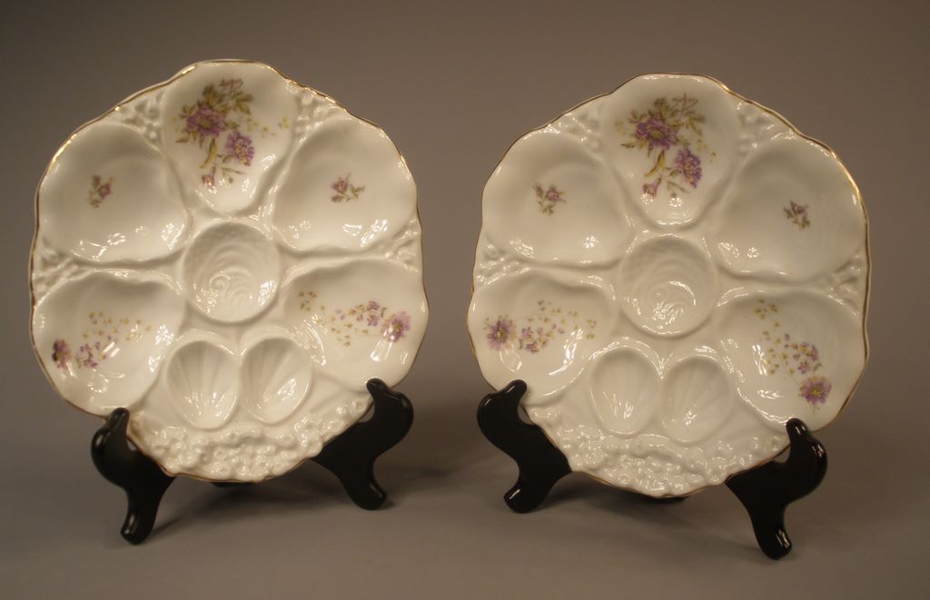 Pair German oyster plates. White w/hand painted lavender flowers. 9"