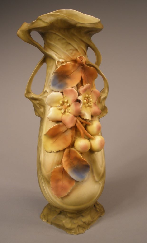 An impressive c1890 15 1/2"h Royal Dux Art Nouveau vase intricately modeled w/applied fruit, blossoms and leaves in earthtone colors.