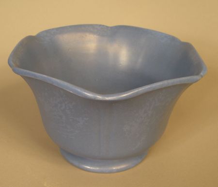George Rumrill operated a company that distributed pottery made by other firms, including Camden & Niloak. From 1932-1937 Red Wing Pottery produced all Rumrill wares, and this bowl is likely by Red Wing in their Alpine Blue glaze. 4 3/4"h x 8"w.