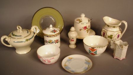 Collection of 10 Items. Mustard w/spoon 5"h; Coalport Mustard 3"h; 1850 Lid, white/pink; Foley Cup; Demitasse w/butterfly handle; Wedgwood English Creamer 4"; 1920 England Myott Sugar Bowl 3"