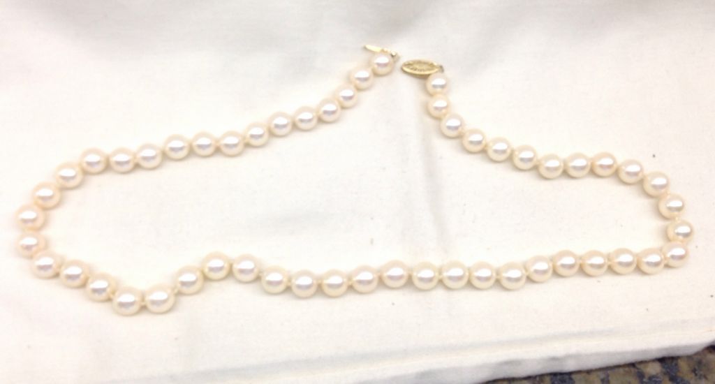 2012 One even stingle strand pearl necklace 18.5" princess ength One even stingle strand pearl necklace 18.5" princess length, knotted with a 14 kt yellow gold clasp containing 53 cultured pearls, 7.5mm in size to 8.0mm in size. The pearls are cream