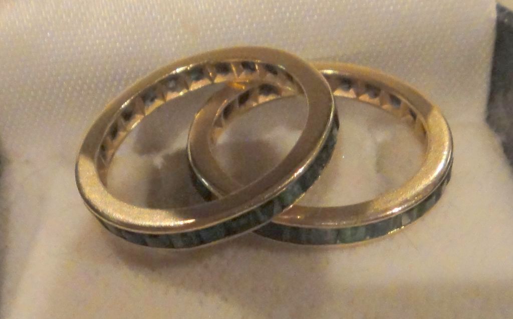 2035 Two 10-14KT yellow gold lady's cast emerald simulant bands Two 10-14KT yellow gold lady's cast emerald simulant bands with a azured shanks with a bright polish finish. Total Weight of Bands 2.30 dwt. Size 6 1/2.