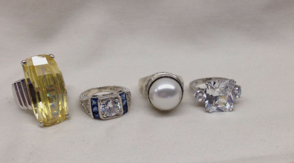 2045 Four Stamped Sterling Silver Lady's Simulated Gemstone Rings Four Stamped Sterling Silver Lady's Simulated Gemstone Rings with a Bright Polish Finish. Sizes vary
