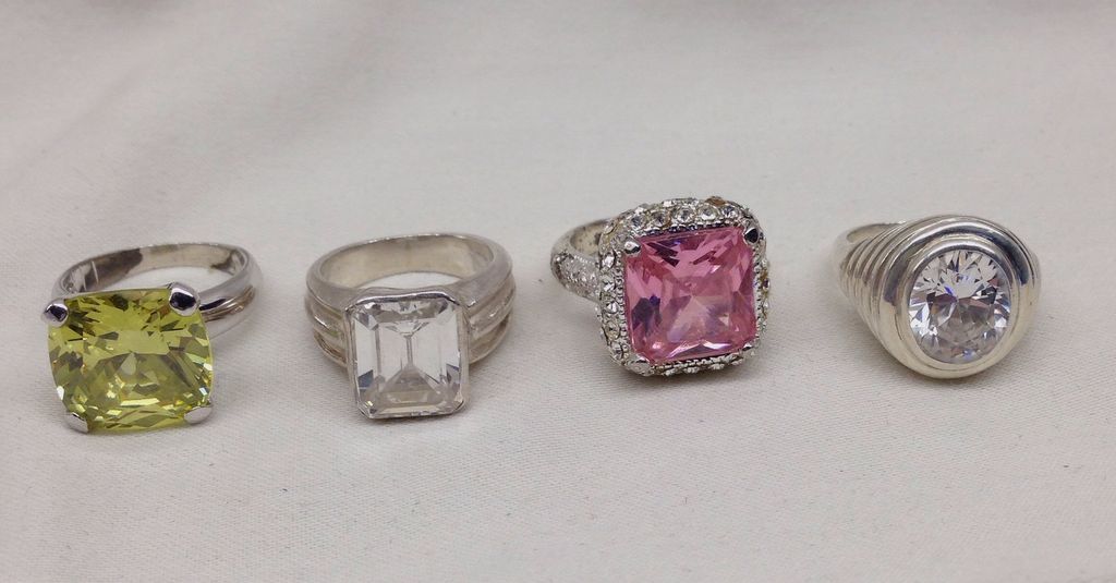 2046 Four Stamped Sterling Silver Lady's Simulated Gemstone Rings with a Bright Polish Finish. Four Stamped Sterling Silver Lady's Simulated Gemstone Rings with a Bright Polish Finish. Sizes vary
