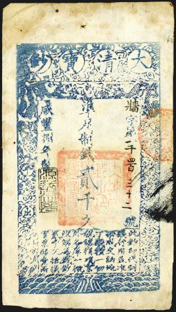 2002 Ch'ing Dynasty, Da Qing Bao Qiao, 1858 Issue. China, Xian Feng year 8 [1858]. 2000 Wen (Cash). Pick-A4f, S/M T6-51, VF to Choice VF with a horizontal fold keeping this note from XF. /