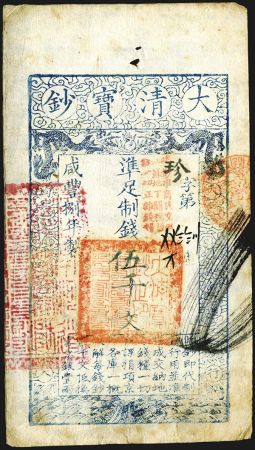 2003 Ch'ing Dynasty, Da Qing Bao Qiao, 1858 Issue. Jiangsu. Xian Feng year 8 [1858]. 5000 Wen (cash). Pick-A5f. SM T6-52. VF condition. /