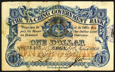 Ta-Ching Government Bank, 1908 "Urga" Branch Issue. China, $1, P-A75, S/M#T10-20, Issued banknote, face green and lilac, back Blue on light brown color with supported arms upper center, S/N E36405, Pin punch Chinese characters in middle, Choice Fine to VF with 4 areas of tape stain on the top margin, extremely rare note in any condition and unpriced in the SCWPM. First time offered by our company.