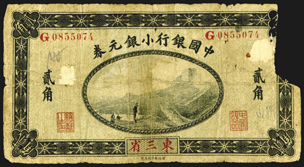 Bank of China, 1914 "Manchuria" Branch Issue Rarity. China, 20 cents, P-36c, S/M#C294-60, Issued banknote, Black o light green underprint with Great Wall at center, back orange, VG condition but there are two small areas of ink loss on the left and right of the face that has not effected the paper, only the undertint ink, as well as 4 small pin holes on the upper right. Unfortunately, there is a 1/2 by 1 inch piece missing from the top right corner. Rare note in any condition.