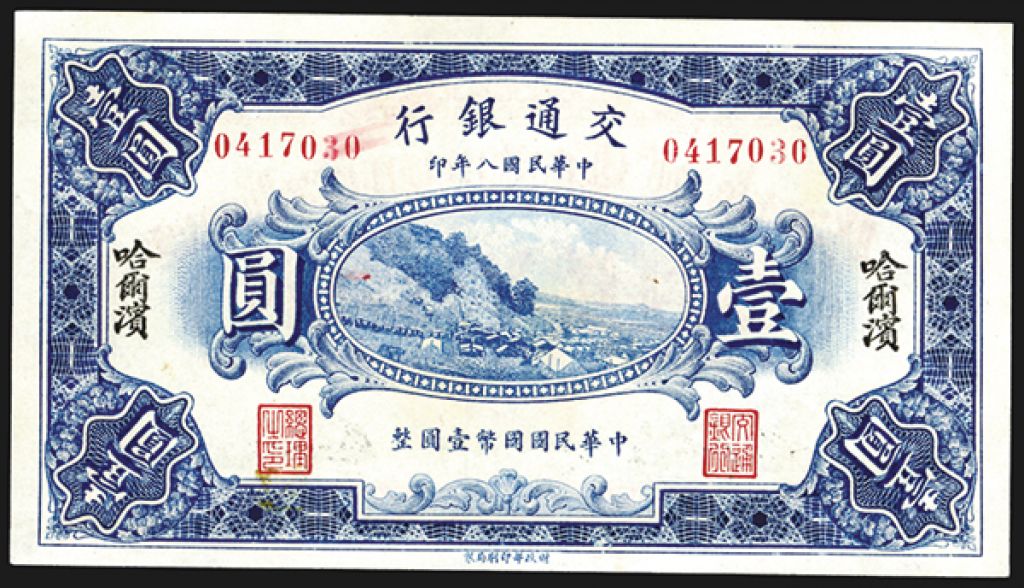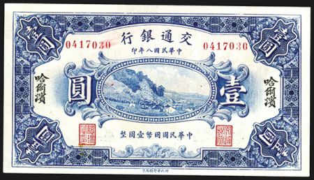 Bank of Communications, 1919 "Harbin" Branch Issue. China, 1 Yuan, P-125, S/M#C126-131, Issued banknote, Blue, Village in middle, back is brown and green, Gem Uncirculated condition. Amazing note rarely seen this nice. BEPP.