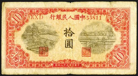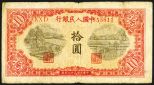 Peoples Bank of China, 1949 Issue Banknote. China, 1949, 10 Yuan, P-815 (S/M#C282-25), Block 9 10 1 (IX X I), S/N 55811, Issued banknote, red and black, Fine.